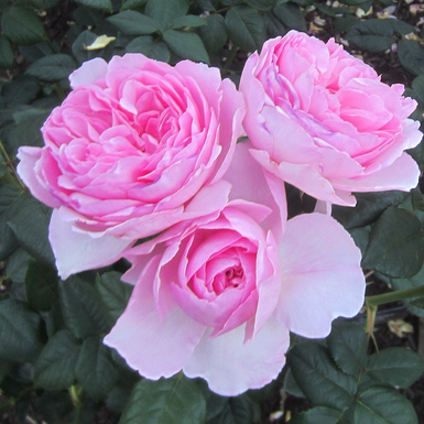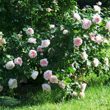 Сорт, обладающий настоящим шармом старинных роз, с красивыми крупными цветками, напоминающими уменьшенные копии Constance Spry. Они глубоко чашевидные, густомахровые, нежно-розового цвета. С возрастом приобретают сиреневый оттенок. Нежно пахнут миррой.