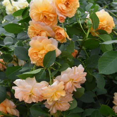 Высокий куст с изящно поникающими побегами, который идеально подходит для заднего плана бордера. Цветки довольно крупные, в форме розетки, абрикосово- оранжевого цвета. Относится к группе Leander (наиболее выносливая и здоровая группа сортов английских ро