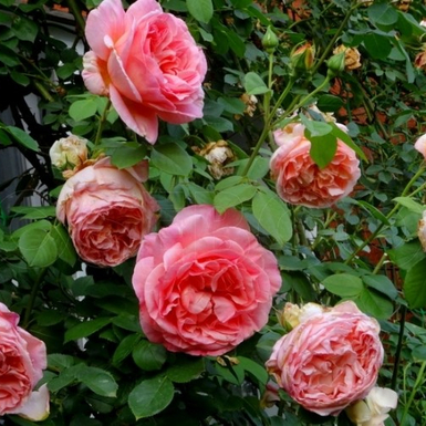 Куст очень мощный с крупной матовой листвой.Цветы расположены и в соцветиях и одиночно. Цвет розово-коралловый.Запах средний.Не боится дождей, устойчива к болезням.