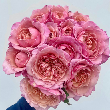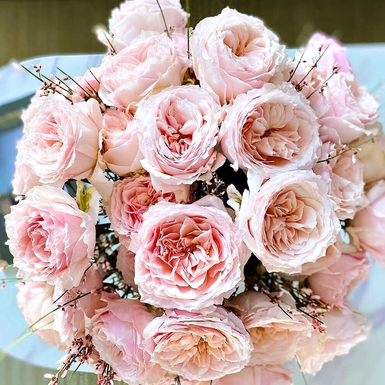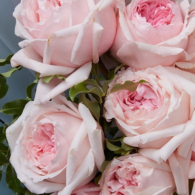 Цветки светло-розовые или с персиковый оттенком в центре, бледно-розовые по краям. Крупные, густомахровые, чашевидные. Имя Tsumugi переводится как «изящно вращающийся» и дано за красивую закрученную укладку лепестков . Интенсивность аромата: 2 из 5, слегк