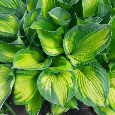 Замечательная яркая хоста с плотными листьями золотисто-желтого цвета и темно-зеленой каймой.