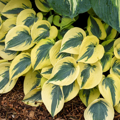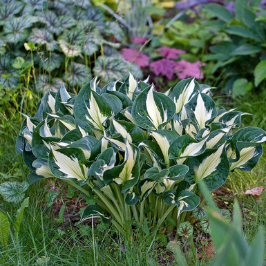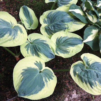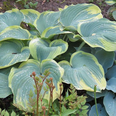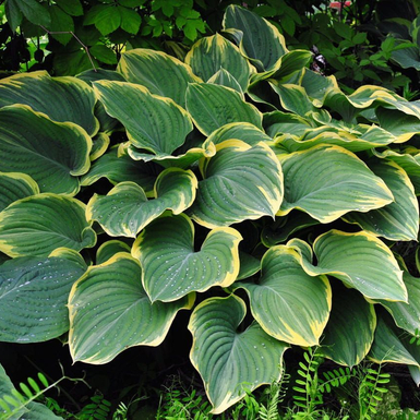 Классическая хоста с большими сине-зелеными сердцевидными листьями, окаймленными широкой кремово-белой полосой.